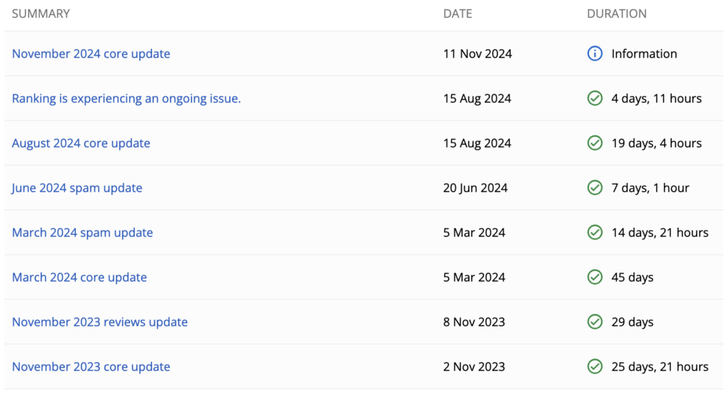 Das November Core Update 2023 hat laut Google Search Status Dashboard insgesamt 25 Tage gedauert, andere Updates, wie das vom März 2024 sogar 45 Tage: