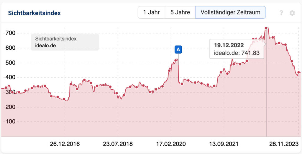 Aber wo Licht ist, findet man auch Schatten: Core Updates sind immer Phasen, in denen sich Webseiten auch von lang andauernden Abwärtstrends stark erholen können. Bei der Analyse der Domain idealo.de, die schon seit geraumer Zeit massiv und kontinuierlich an Sichtbarkeit verliert, hat sich auch beim aktuellen Update nicht viel getan – Tendenz nach wie vor fallend. Vor etwa einem Jahr war die Plattform auf einem Alltime-High von 741 Sichtbarkeitspunkten angekommen. Davon sind aktuell nur noch knapp 450 übrig: