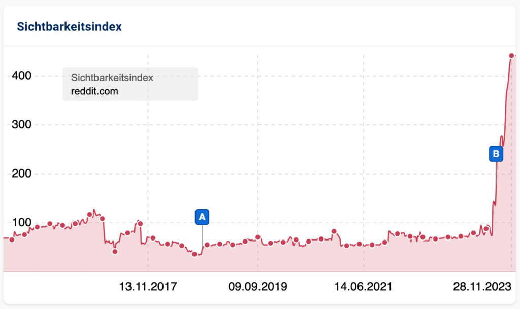 Ein sehr klarer Gewinner des November Core Updates ist die Domain reddit.com im amerikanischen Suchmarkt, wie das Sichtbarkeitschart eindrücklich beweist: