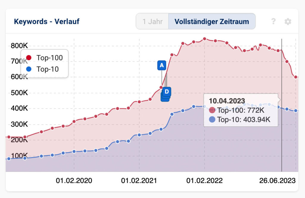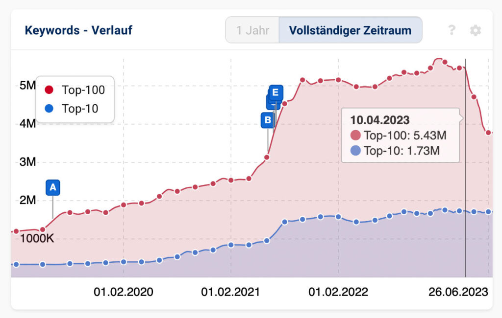 Wer sich übrigens gewundert hat, warum die Anzahl der Top100 Keywords in vielen Tools plötzlich (ziemlich genau seit 10.04.2023) eingebrochen ist, hat damit nun die Antwort. Die SERP-Scraper bekommen einfach keine Top100 Ergebnisse in Form von 10×10 Suchergebnissen zurück. Und die Anzahl der Ergebnisse per SERP als Parameter an die Suche zu hängen, entspricht nicht einem „normalen“ Nutzerverhalten. Anbei ein Vergleich von otto.de, aboutyou.de und zalando.de (in dieser Reihenfolge), der zeigt, dass alle drei Seiten insgesamt ab dem 10. April deutlich verloren haben. OTTOs Top100 Keywords sind auf Grund der Änderungen von 5,34 Mio. am 10.04. auf aktuelle 3,78 Mio. eingebrochen.