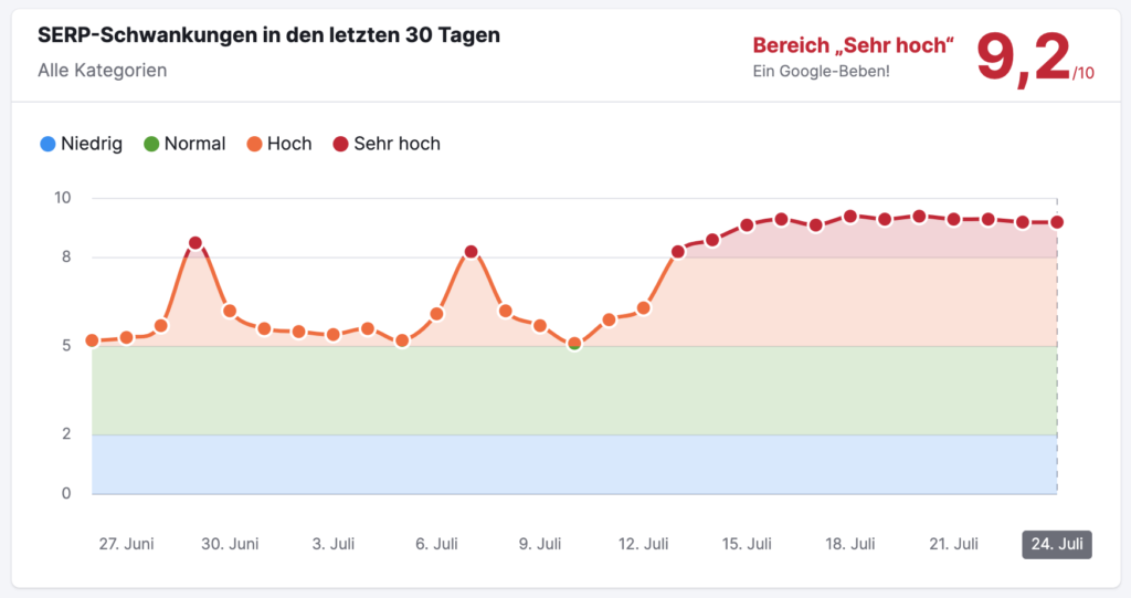 In der vergangenen Woche liefen die SEO-Nachrichten heiß: alle Tools und Datenanalysten haben weltweit starke Schwankungen und eine hohe Volatilität in den Suchergebnissen gemessen. Ein SEO-Beben, wie Toolanbieter SEMrush in seinem Chart treffend schreibt.