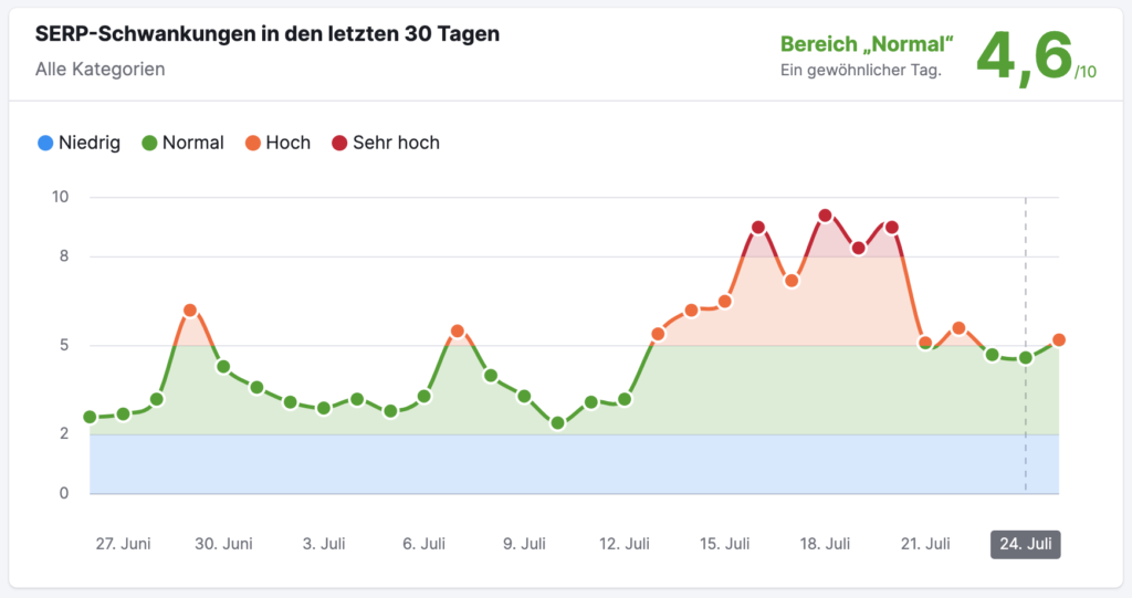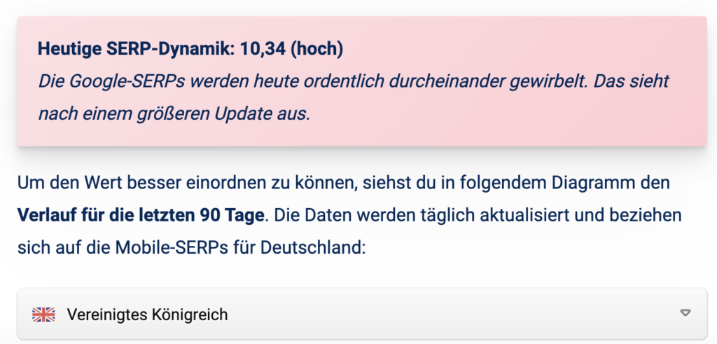 Im Vergleich mit anderen Anbietern, wie z.B. dem Sistrix Update Radar, sieht man allerdings abweichende Daten. Für Deutschland herrscht eher eine ruhige Wetterlage, aber für Großbritannien zeigt Sistrix im Vergleich zu SEMrush eine sehr hohe SERP-Dynamik.