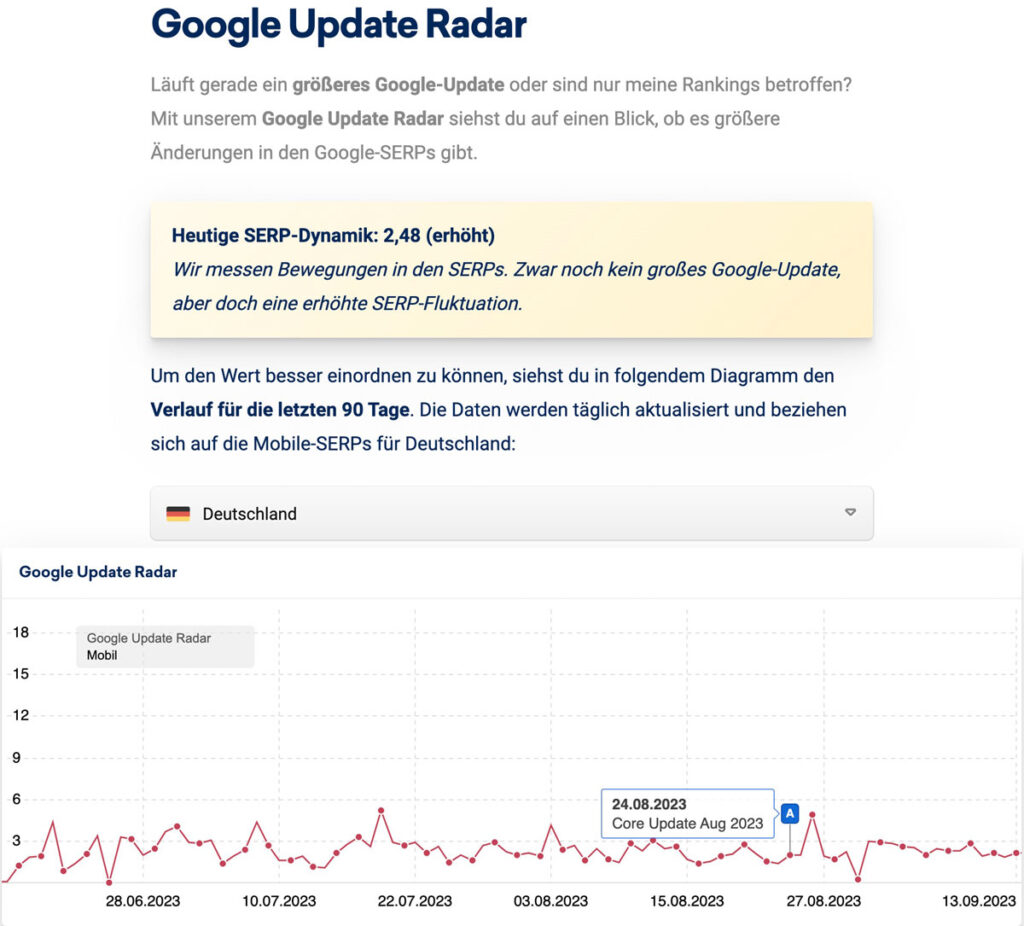 Die gängigsten SEO-Tools bieten die Möglichkeit Schwankungen auf den SERPs zu erkennen, welche auf ein bevorstehendes oder bereits ausgerolltes Google Update hindeuten.