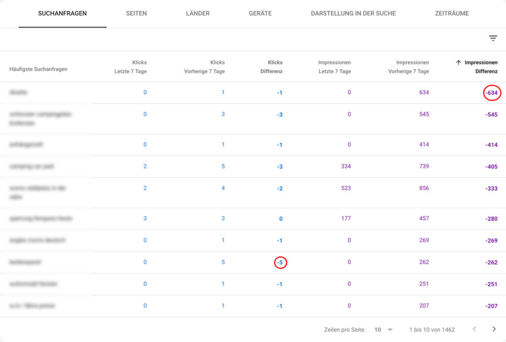 Wenn der Rückgang in der Sichtbarkeit nicht direkt mit den Brand-Keywords zusammenhängt, ist die Google Search Console ein hilfreiches Instrument, um die betroffenen Suchbegriffe zu ermitteln. In der GSC betrachtest Du nun, welche spezifischen Suchanfragen den größten Einbruch im Traffic und bei den Impressionen erlebt haben, wie in unserem obigen Screenshot dargestellt. Diese Informationen liefern dann Hinweise darauf, welche Bereiche Deiner Webseite optimiert werden müssen. Obwohl viele Suchanfragen zu Deiner Webseite führen, weisen nur einige einen signifikanten Rückgang auf. Diese zentralen Anfragen sollten im Mittelpunkt Deiner weiteren Maßnahmen stehen.