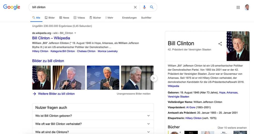 Ähnlich wie bei einer Google-Suche erscheinen jetzt zusätzliche Informationen zu gesuchten Personen. In einer Testsuche nach „Bill Clinton“ ergibt sich folgendes Bild: