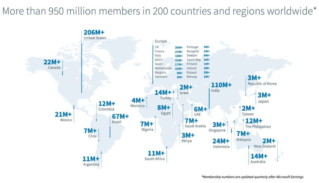 Trotz des Rückzugs aus China aufgrund regulatorischer Herausforderungen in der Region berichtet LinkedIn weiterhin von 930 Millionen Mitgliedern. Interessanterweise hat LinkedIn, obwohl China aus seiner Mitgliederkartenanzeige entfernt wurde, die über 59 Millionen chinesischen Mitglieder nicht aus seiner Gesamtzahl entfernt. Nach den Zahlen auf der obigen Karte hat LinkedIn derzeit tatsächlich, 728 Millionen Mitglieder.