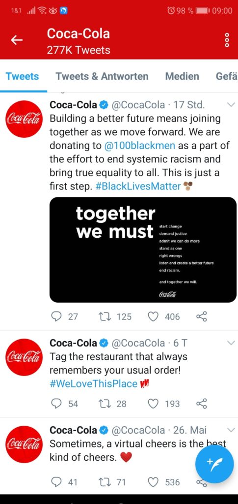 Coca-Cola ist stets auf allen Social-Media-Plattformen aktiv und arbeitet daran, ein personalisiertes Kundenerlebnis zu schaffen. Sie haben 106 Millionen Follower auf Facebook, 2,7 Millionen auf Instagram. Beeindruckend ist zudem Coca-Colas Twitter- Profil mit 3,3 Millionen Abonnenten, über welches das Unternehmen eine direkte Verbindung mit all ihren Followern erfolgreich herstellt.