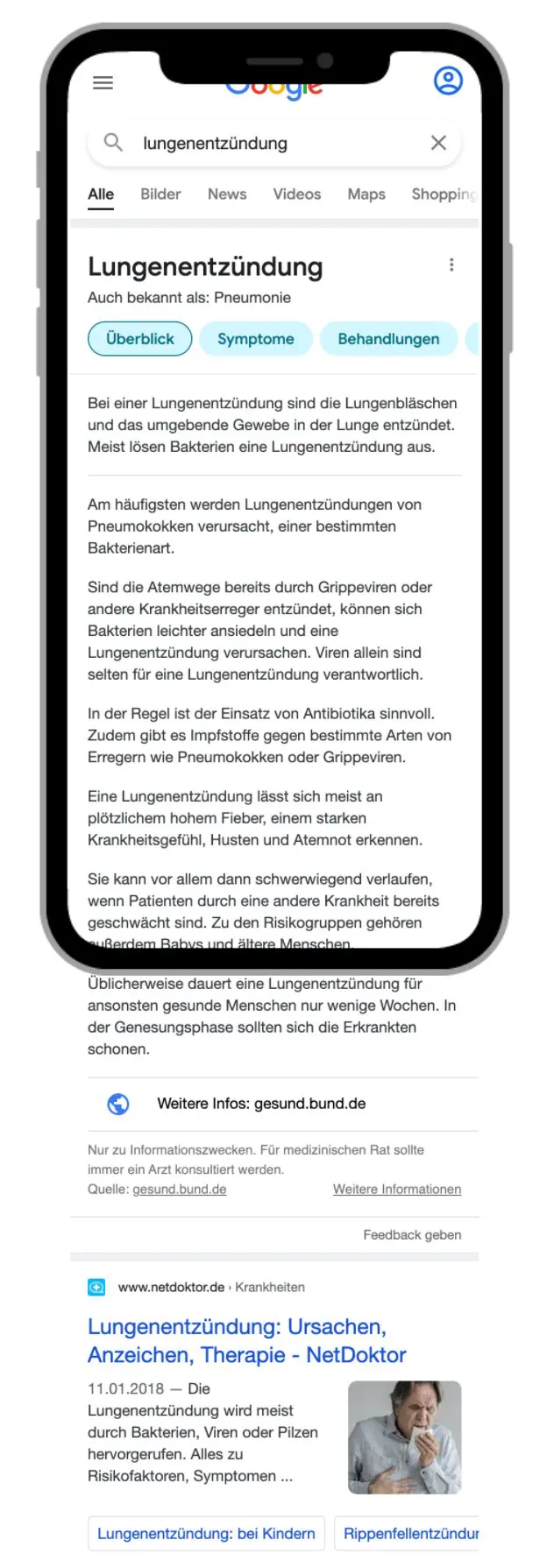 Die sogenannten Knowledge Panels liefern den Nutzern Informationen direkt in der Ergebnisseite, ohne dass ein Ergebnis angeklickt werden muss. Beim googeln via Smartphone steht diese Integration sogar direkt an erster Stelle. Auch NetDoktor.de stellt regelmäßig unabhängig überprüfte Gesundheitsinformationen zur Verfügung und hat sich auch vermutlich deshalb nicht gerade erfreut gezeigt. Die Klickraten des Portals sind bei einigen wichtigen Keywords seit Beginn der Kooperation stark zurückgegangen. Warum dies wenig verwunderlich ist, hat SISTRIX mit der Visualisierung einer mobilen SERP unterstrichen: