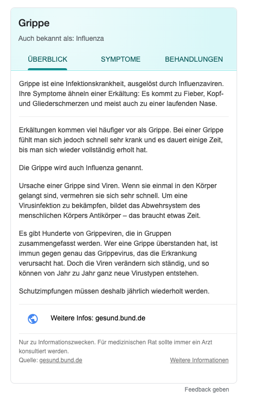 Dem Nutzer stehen innerhalb der Kästen drei verschiedene Reiter zur Verfügung: „Überblick“, „Symptome“ und „Behandlungen“. Durch einen Link innerhalb der Knowledge Panels gelangen Nutzer*innen direkt zum jeweiligen Artikel des Nationalen Gesundheitsportals. Die Informationen stammen unter anderen vom Deutschen Krebsforschungszentrum, dem Institut für Qualität und Wirtschaftlichkeit im Gesundheitswesen, dem Robert Koch-Institut und medizinischen Fachgesellschaften.
