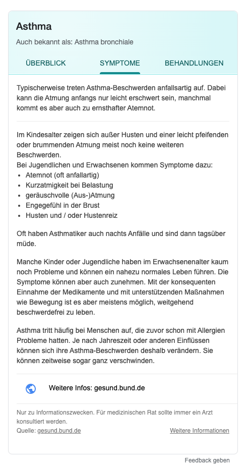 So sehen die Infokästen aus -auch Knowledge Panels genannt. Sie werden vorerst für insgesamt 160 verschiedene Krankheiten ausgespielt: