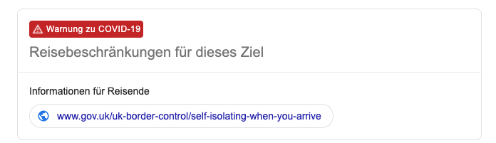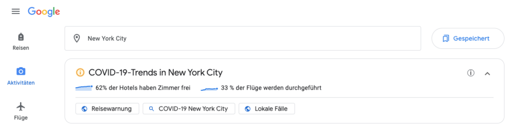 Google-Suchergebnisse zu Hotels, Flügen und sonstigen Unternehmungen liefern direkt Informationen zu aktuellen COVID-19-Reisewarnungen. Liegen keine Einschränkungen vor, wird zusätzlich über die derzeitige Flug-Situation für das entsprechende Reiseziel und über weitere Faktoren wie etwa Hotel-Verfügbarkeiten informiert. Auf google.com/travel können auch Trends bei der Verfügbarkeit von Flügen und Hotels in den letzten sechs Monaten sowie Links zu lokalen Meldungen, wie z.B. die Anzahl der COVID-19-Fälle in der Region, eingesehen werden.