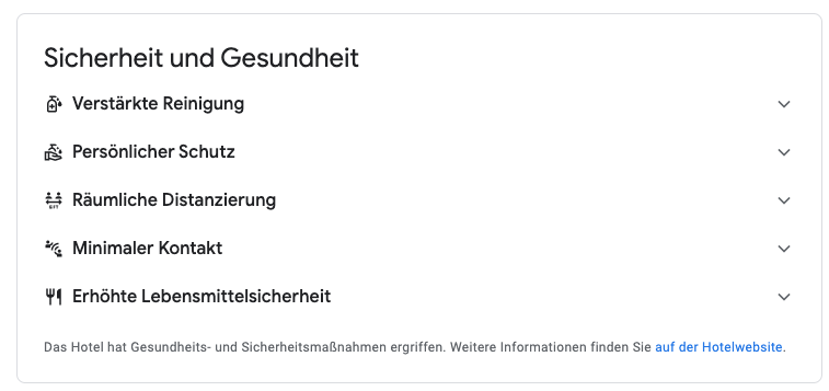 „Viele Hotels und Ferienwohnungen ergreifen als Reaktion auf COVID-19 zusätzliche Maßnahmen, um die Sicherheit der Gäste zu gewährleisten. Wenn Sie jetzt auf google.com/travel nach einer Übernachtungsmöglichkeit suchen und sich eine bestimmte Immobilie ansehen, erhalten Sie möglicherweise einen Hinweis, wenn zusätzliche Gesundheits- und Sicherheitsvorkehrungen, wie etwa eine verbesserte Reinigung, getroffen werden. Tippen Sie auf die Registerkarte „Über“, um die vollständige Liste zu sehen.“