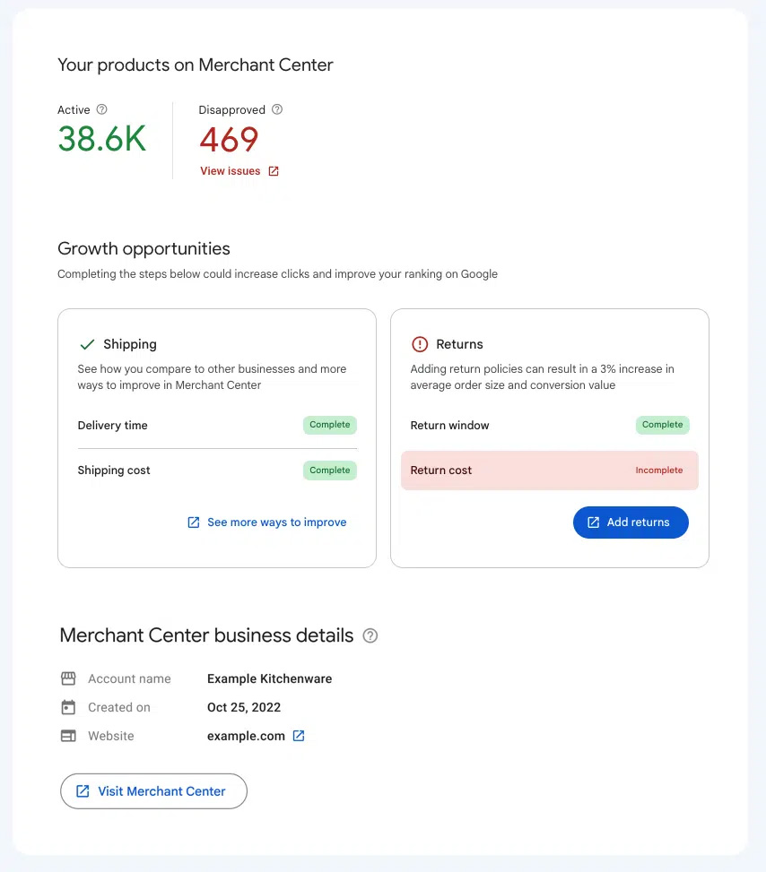 „Die zweite Verbesserung zeigt Händlern Möglichkeiten, Klicks zu erhöhen und die Platzierung von Produkten auf Google zu verbessern.“