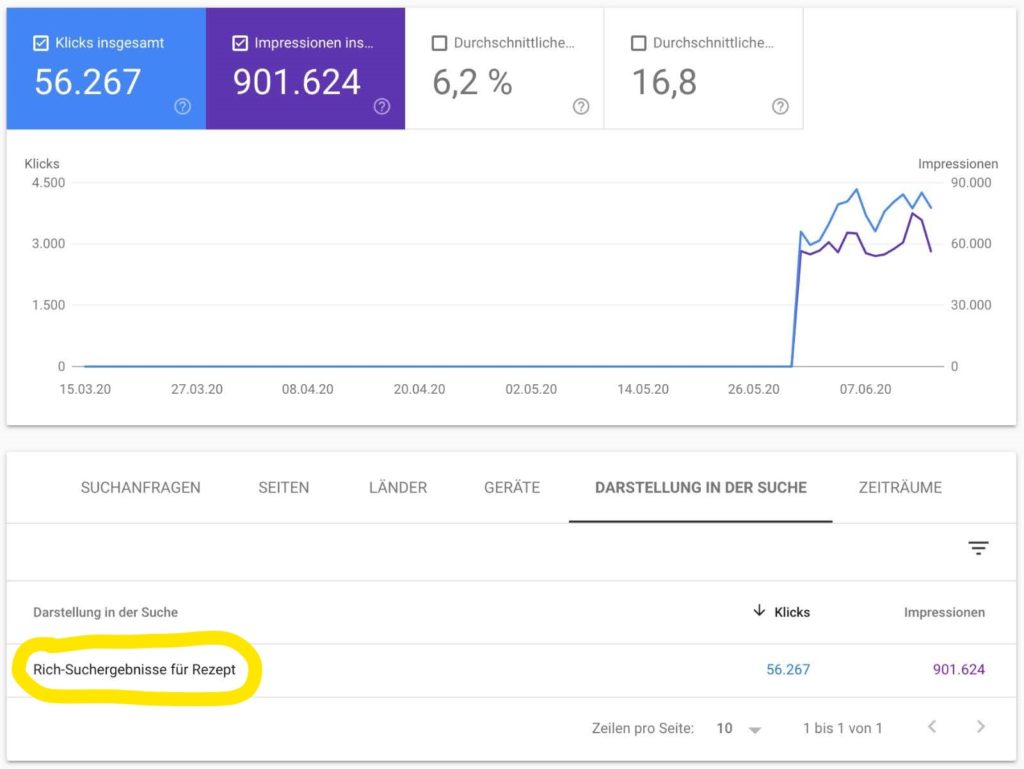 Nun können demnach Klicks, Impressionen und durchschnittliche Position in den Suchergebnis-Seiten speziell für verschiedene Rezept-Ergebnisse nachvollzogen werden: