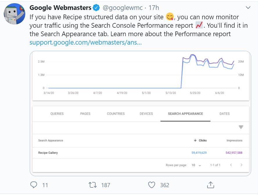 Die Google Search Console bietet ab sofort eine praktische neue Funktion: spezielle Leistungsberichte für Rezept-Rich-Snippets! Dazu twitterte Google Webmasters diesen Montag folgendes: