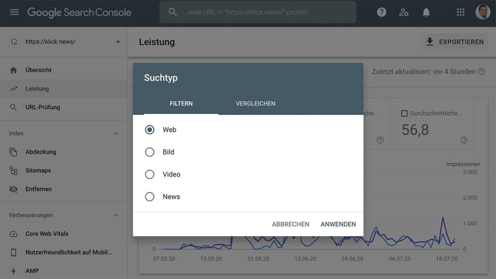 Google Search News tab data now in Search Console Performance report. We’ve recently added new data to the Performance report in Search Console: Google Search’s News tab data. This data shows clicks, impressions, and click-through rate for any links seen in the „News“ tab in Google Search results. To access this data in the report, click the „Search type: Web“ filter on the top of the report, then select „News“. For your convenience, you can also access your News search data directly by clicking the button below.