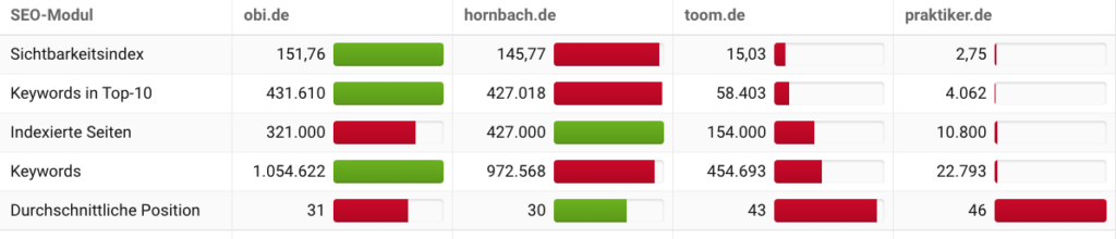 Auch im Wettbewerbsvergleich mit drei weiteren großen Baumärkten in Deutschland steht Obi sehr gut da: der Sichtbarkeitswert liegt weit über denen der Konkurrenz, außerdem liefert Obi verhältnismäßig die meisten Keywords in den Top-10:
